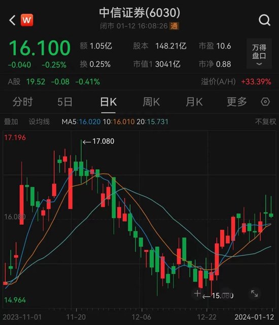 据Wind数据,2023年9月4日至2024年1月11日,中信证券H股价格区间为14.64港元至17.08港元;截至1月12日港股收盘,中信证券H股报16.10港元/股。