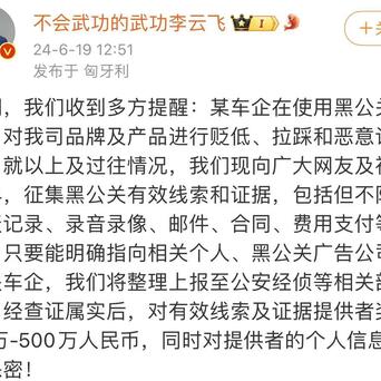 比亚迪这次被逼急了,悬赏20-500万元向广大网友及社会各界征集黑公关有效线索和证据!据比亚迪李云飞称,已收到多方举报,有车企使用黑公关手段对比亚迪品牌及产品进行贬低和恶意诋毁等不正当竞争行为,近期会有批量诋毁比亚迪品牌、产品的视频出现在网络上。